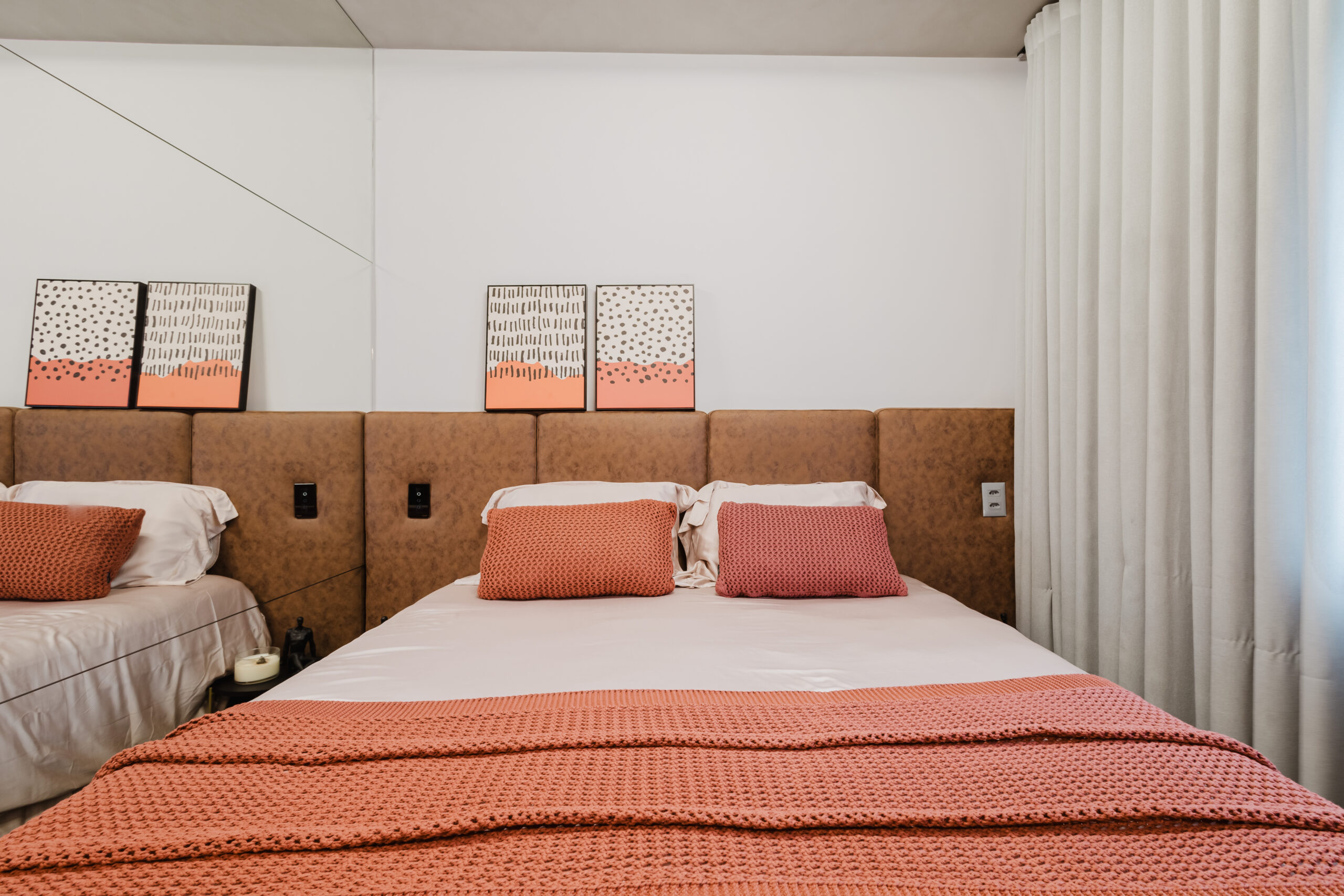 A marcenaria com portas passantes e espelho colado cria amplitude visual e um visual minimalista.