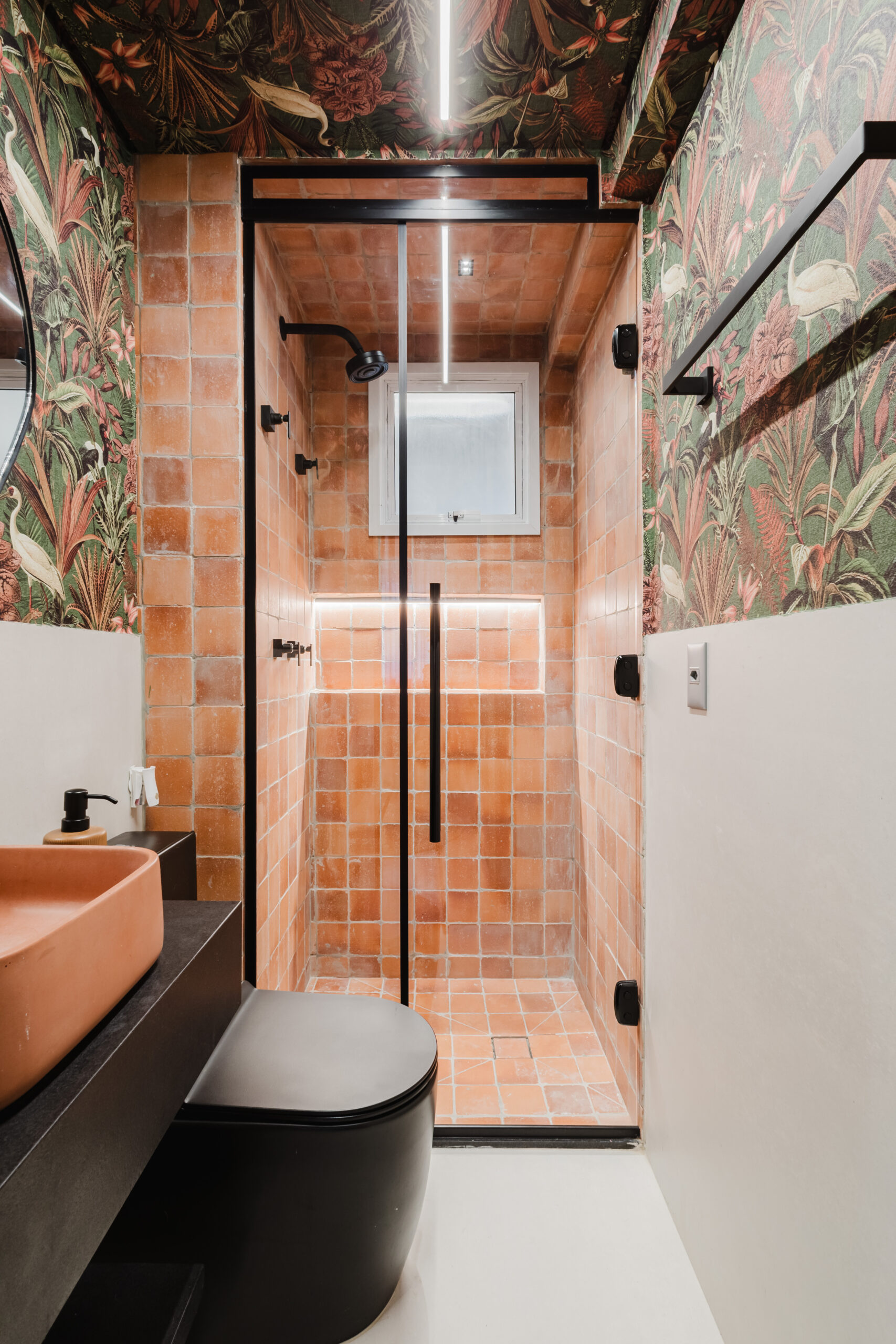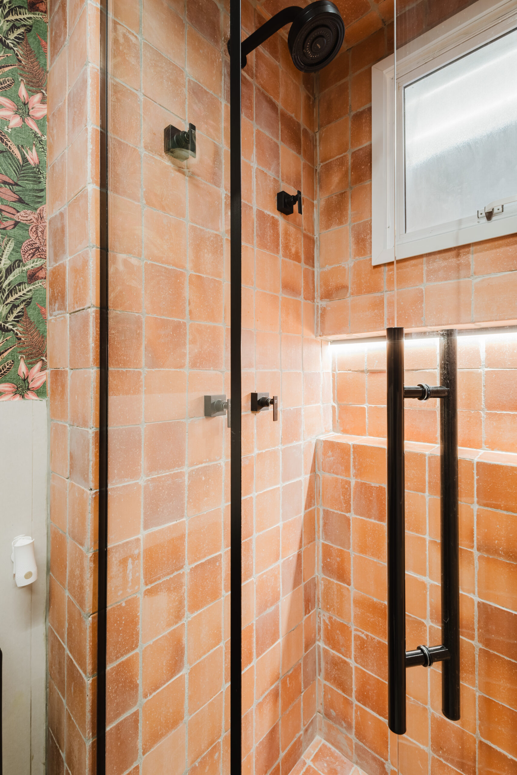 O revestimento artesanal da Lepri (12×12 cm), aplicado no piso, nicho e teto do box, traz textura e conforto tátil, evocando a sensação natural do barro.