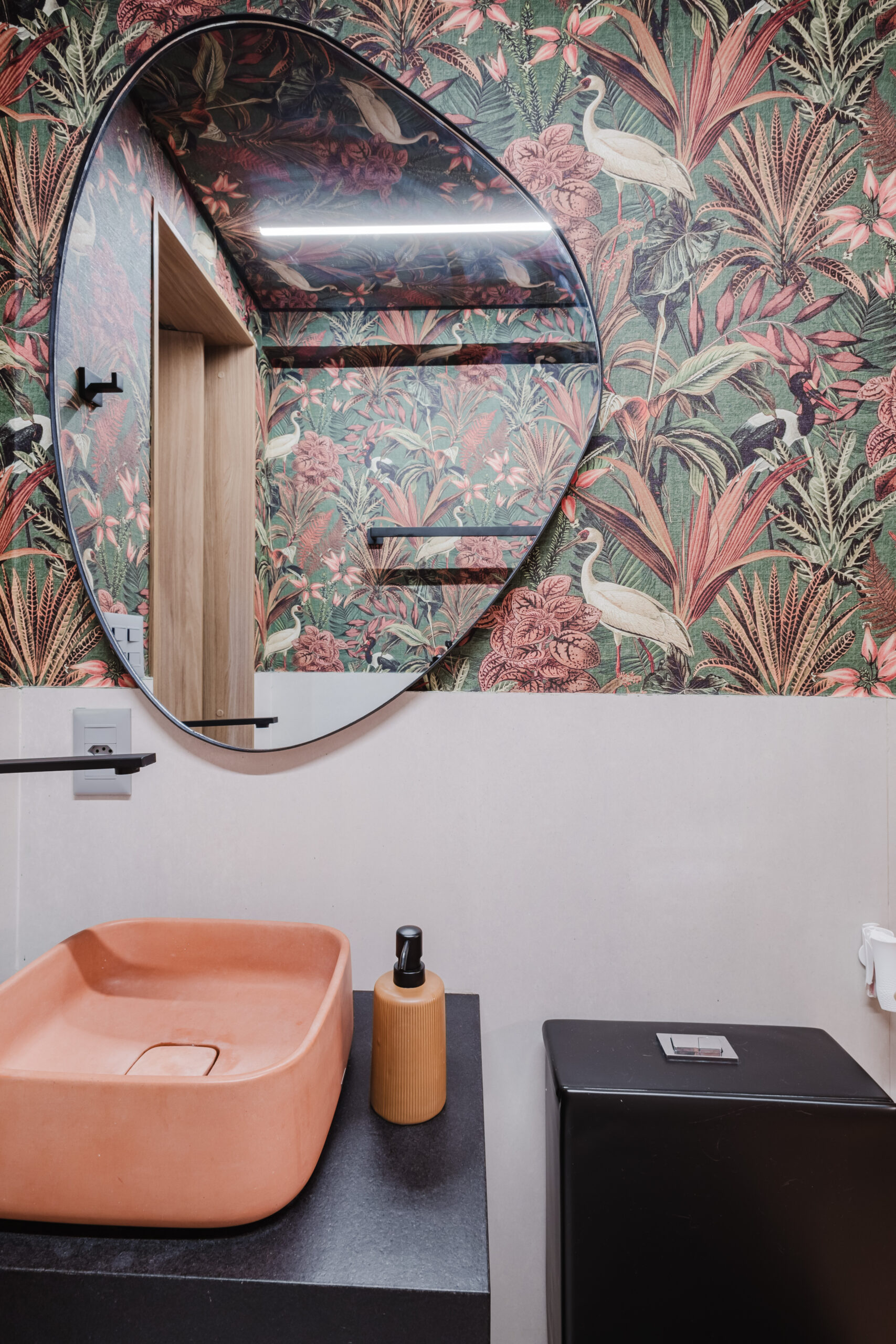 A bancada e cuba em granito São Gabriel escovado, combinadas com louças pretas e papel de parede verde da Ciça Braga, criam um ambiente sofisticado, com contraste de cores e materiais.