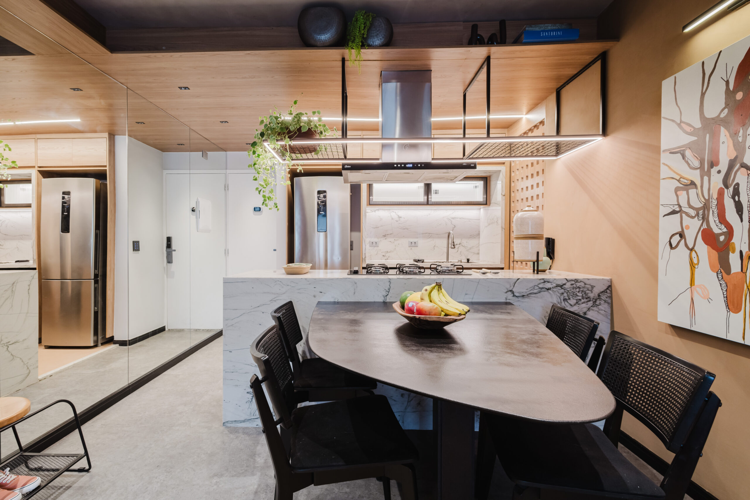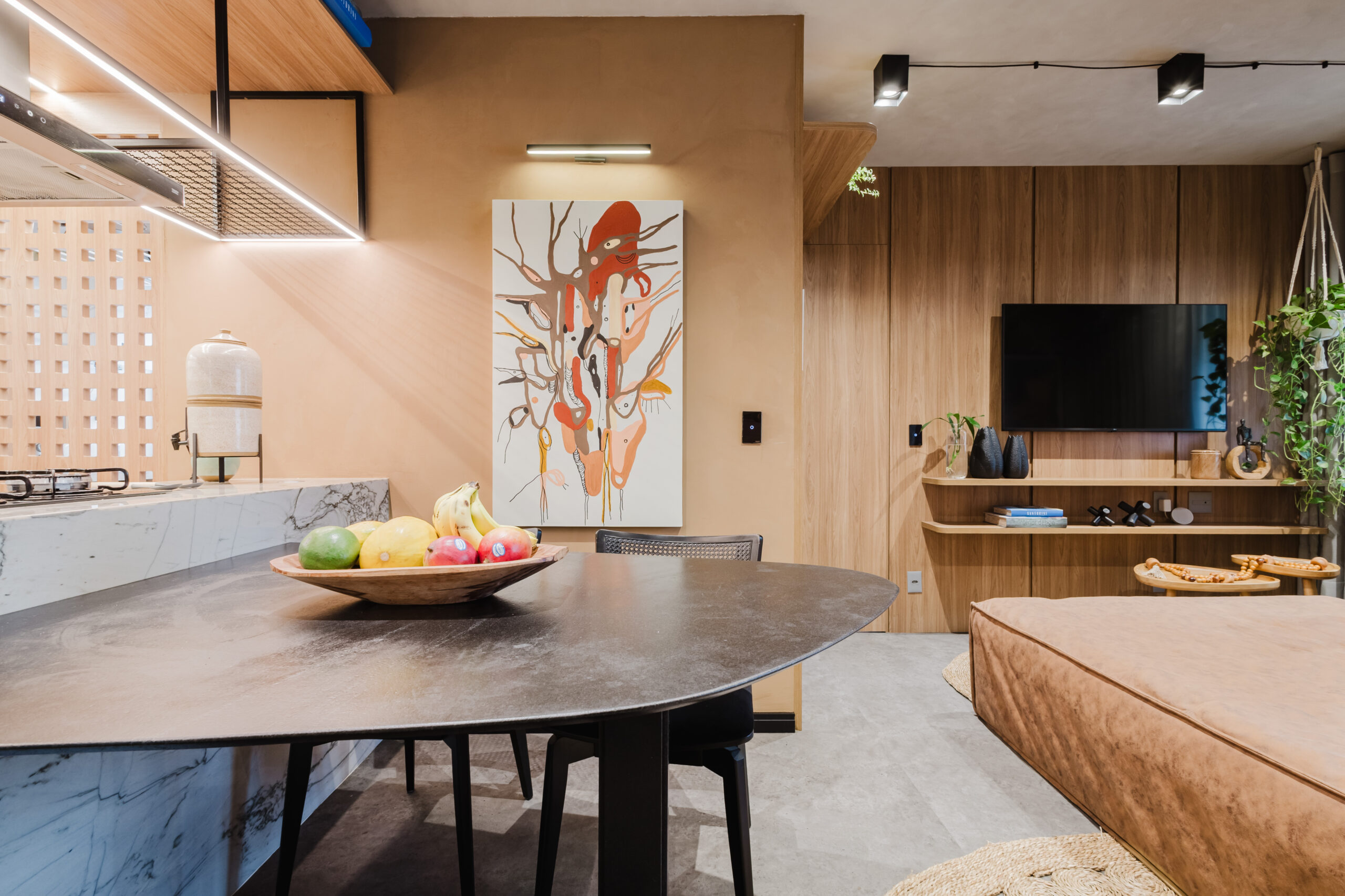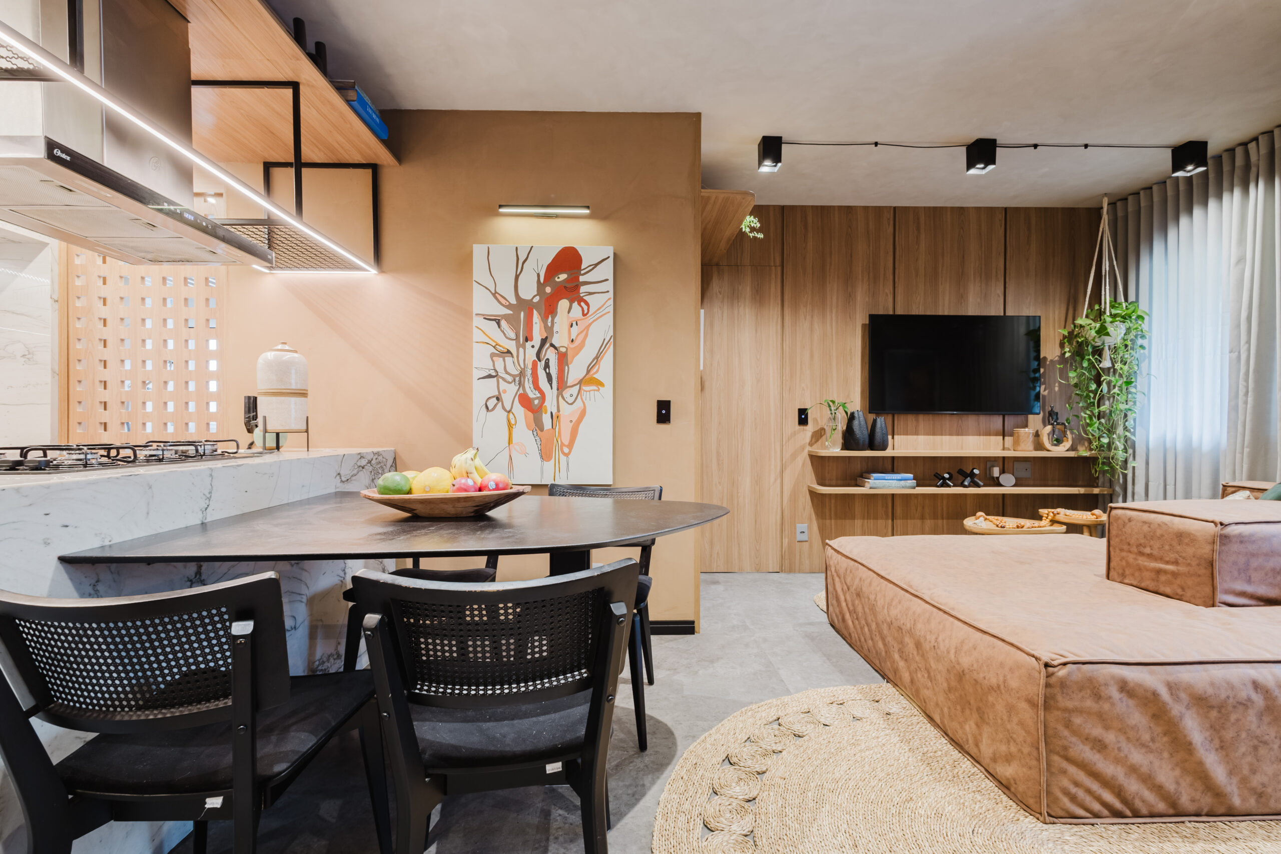 O projeto é um exemplo de como espaços compactos podem se transformar com soluções inteligentes de marcenaria e integração entre os cômodos.