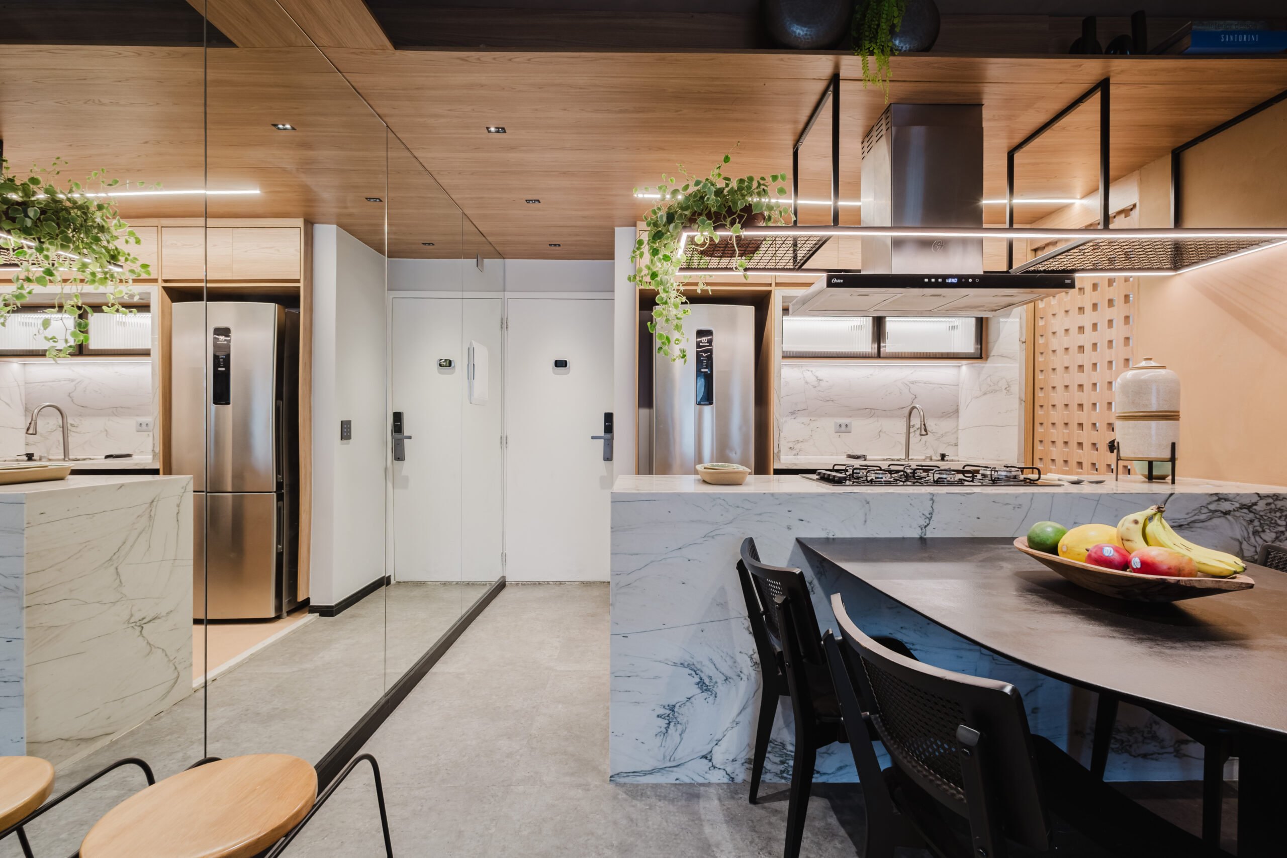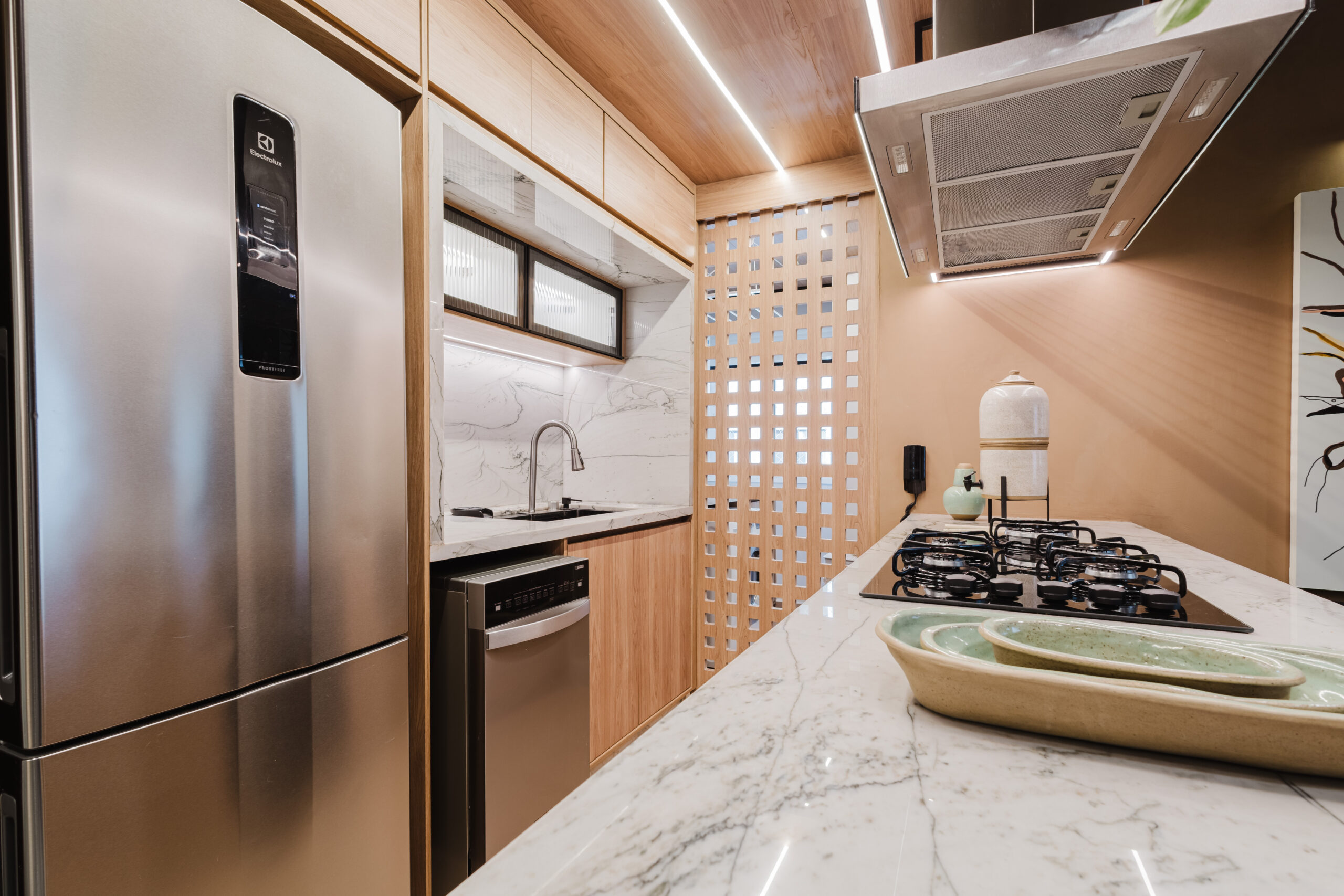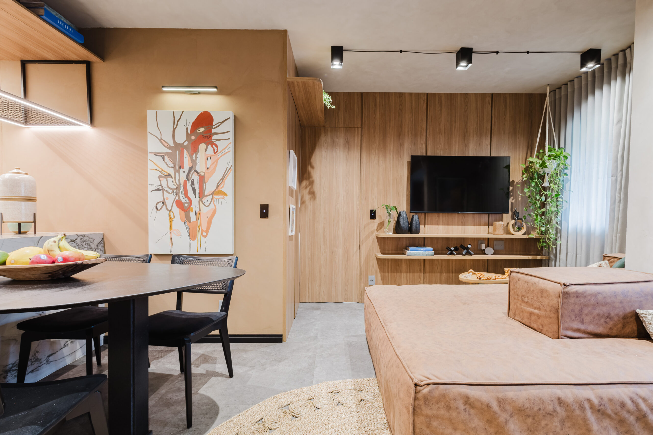 O projeto é um exemplo de como espaços compactos podem se transformar com soluções inteligentes de marcenaria e integração entre os cômodos.