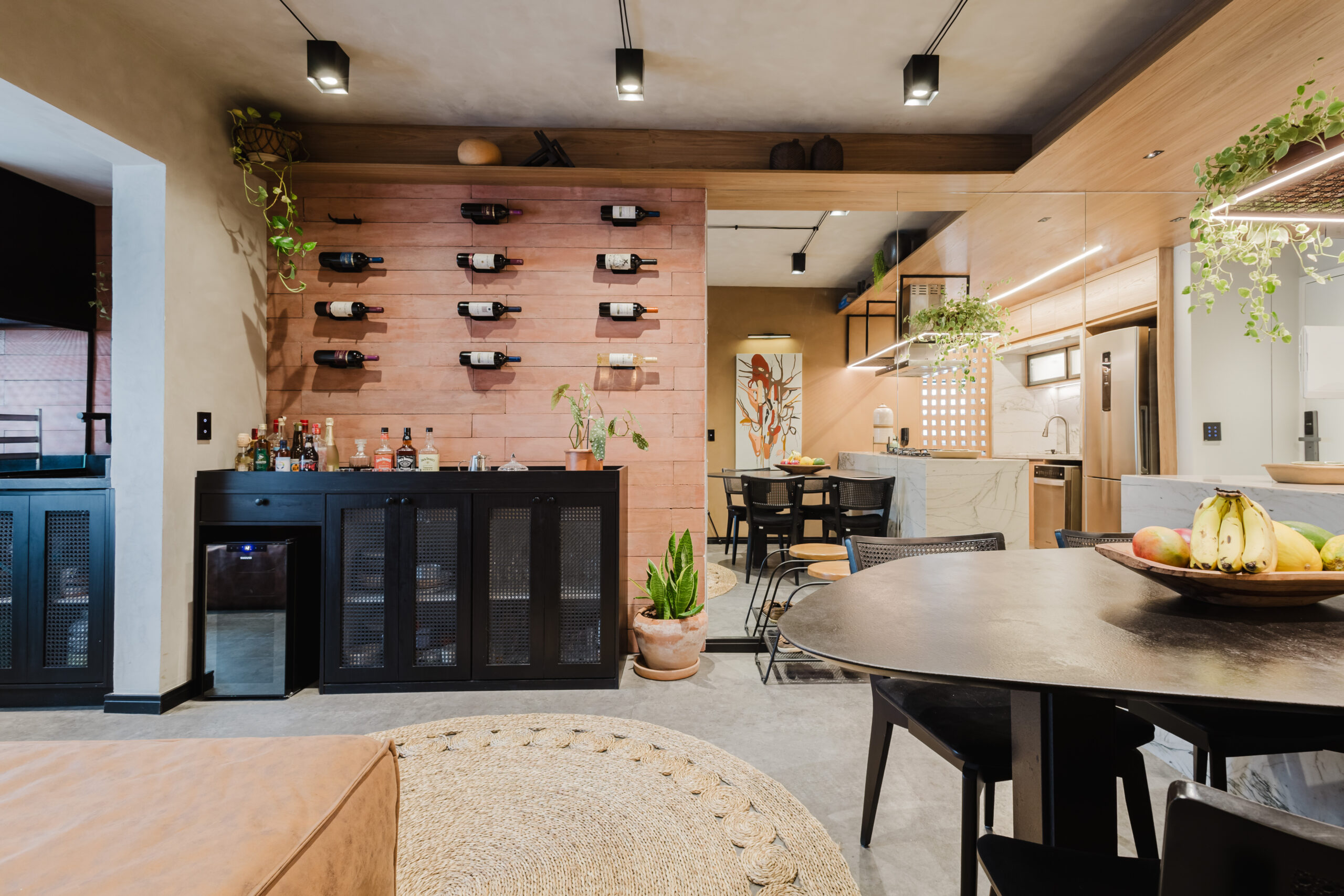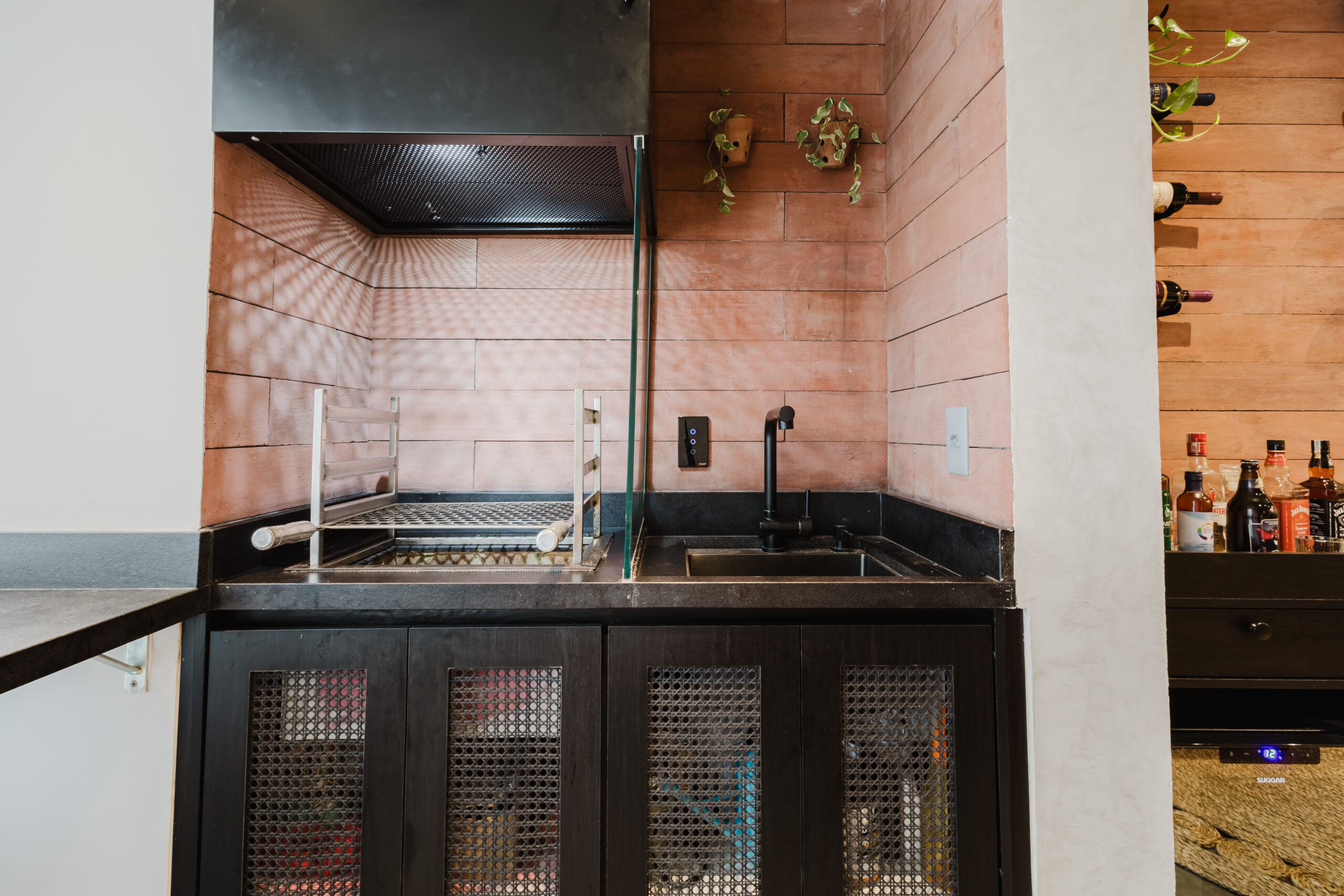 O bar com estrutura metálica em metalon preto, nichos para vinhos, adega climatizada e churrasqueira revestida com cerâmica Portobello complementam o espaço com funcionalidade e identidade.