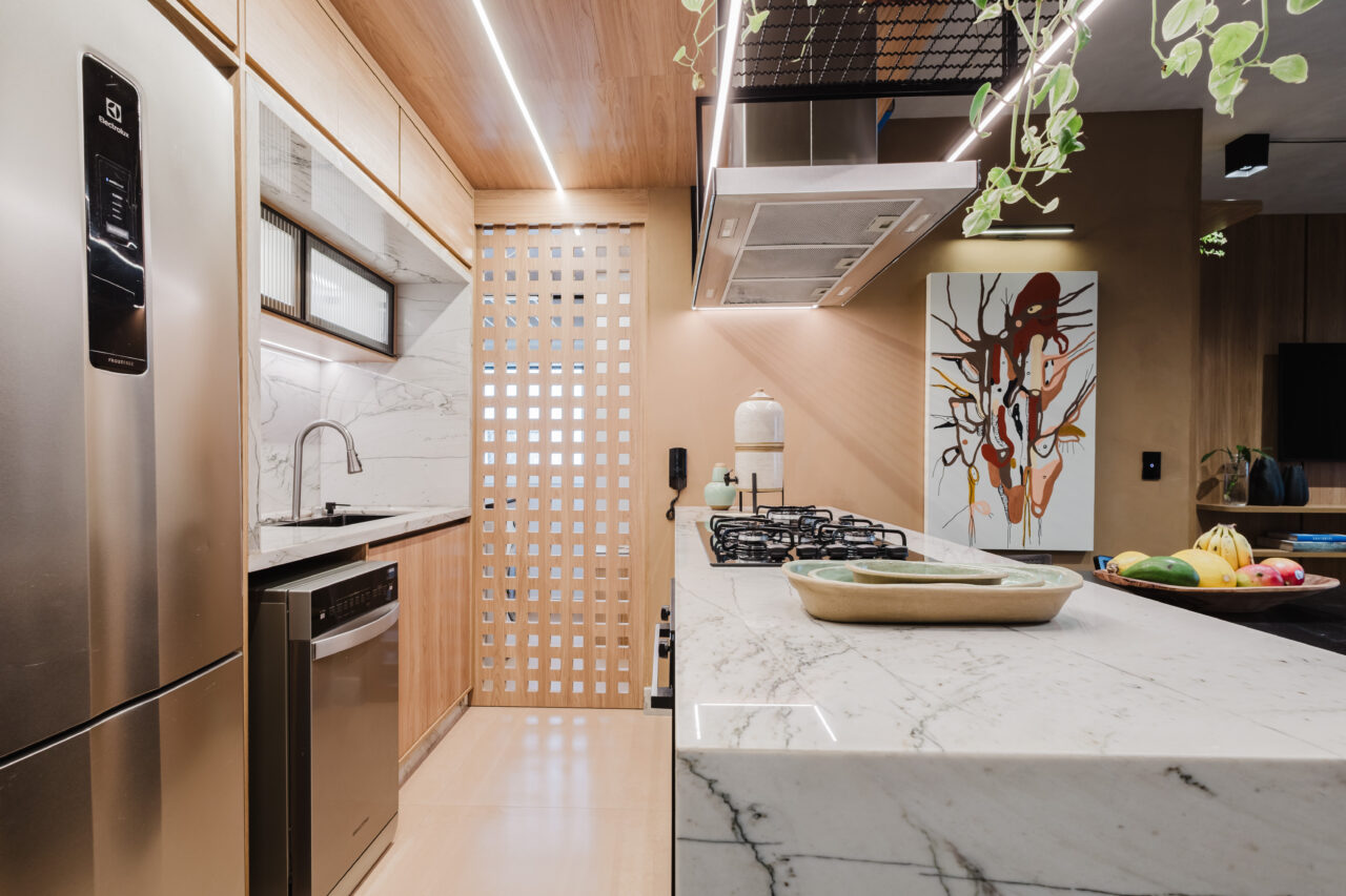 A ilha central funciona como elemento de transição entre a área social e a cozinha, servindo tanto para preparo quanto para refeições rápidas.