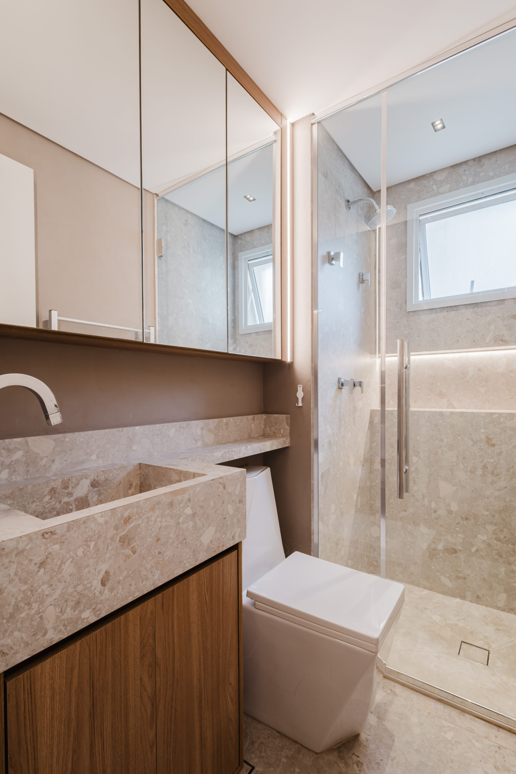 O banheiro da suíte é um exemplo de design funcional em espaços pequenos.