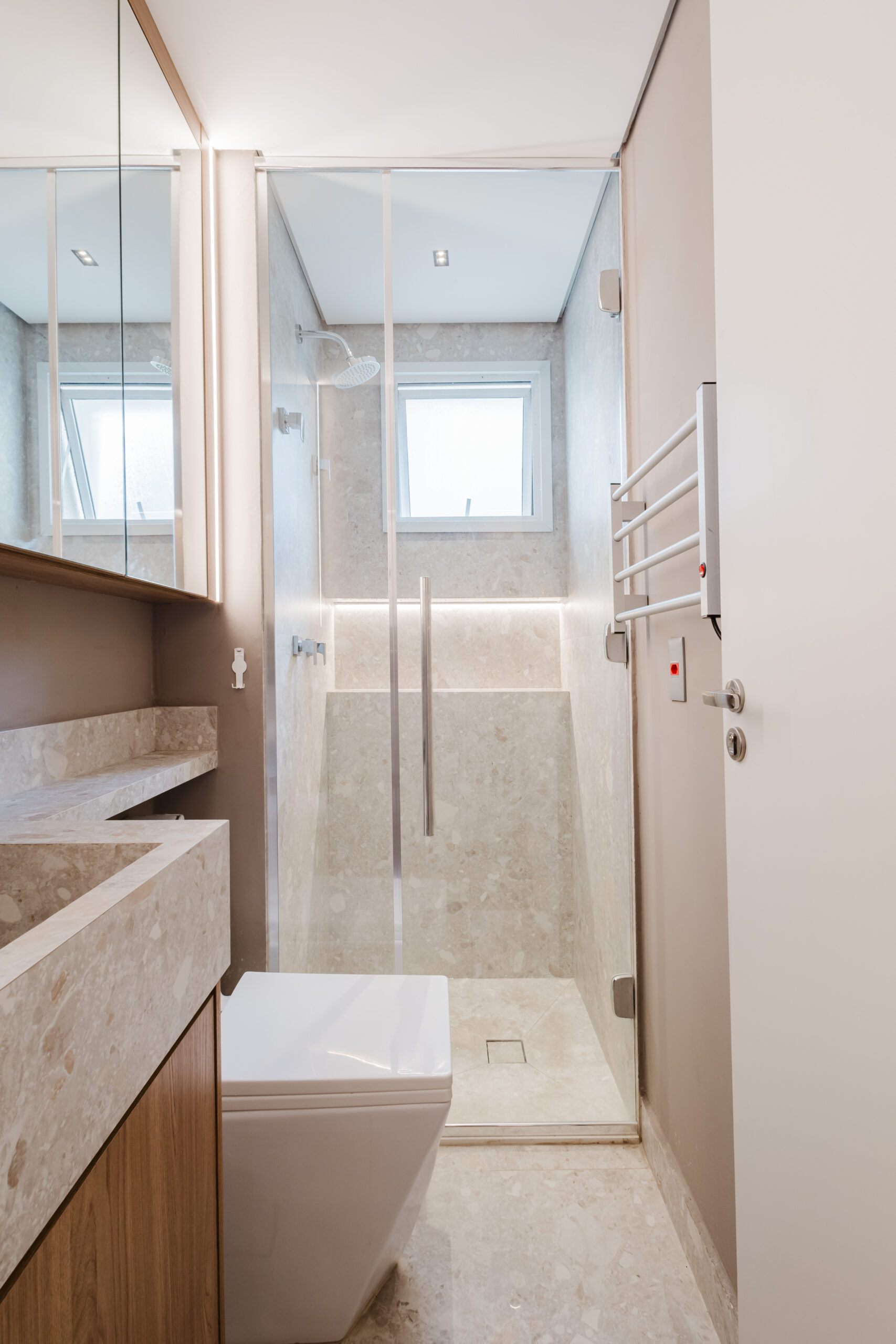 O nicho embutido, o ralo oculto e o box até o teto completam o projeto com soluções inteligentes e elegantes.