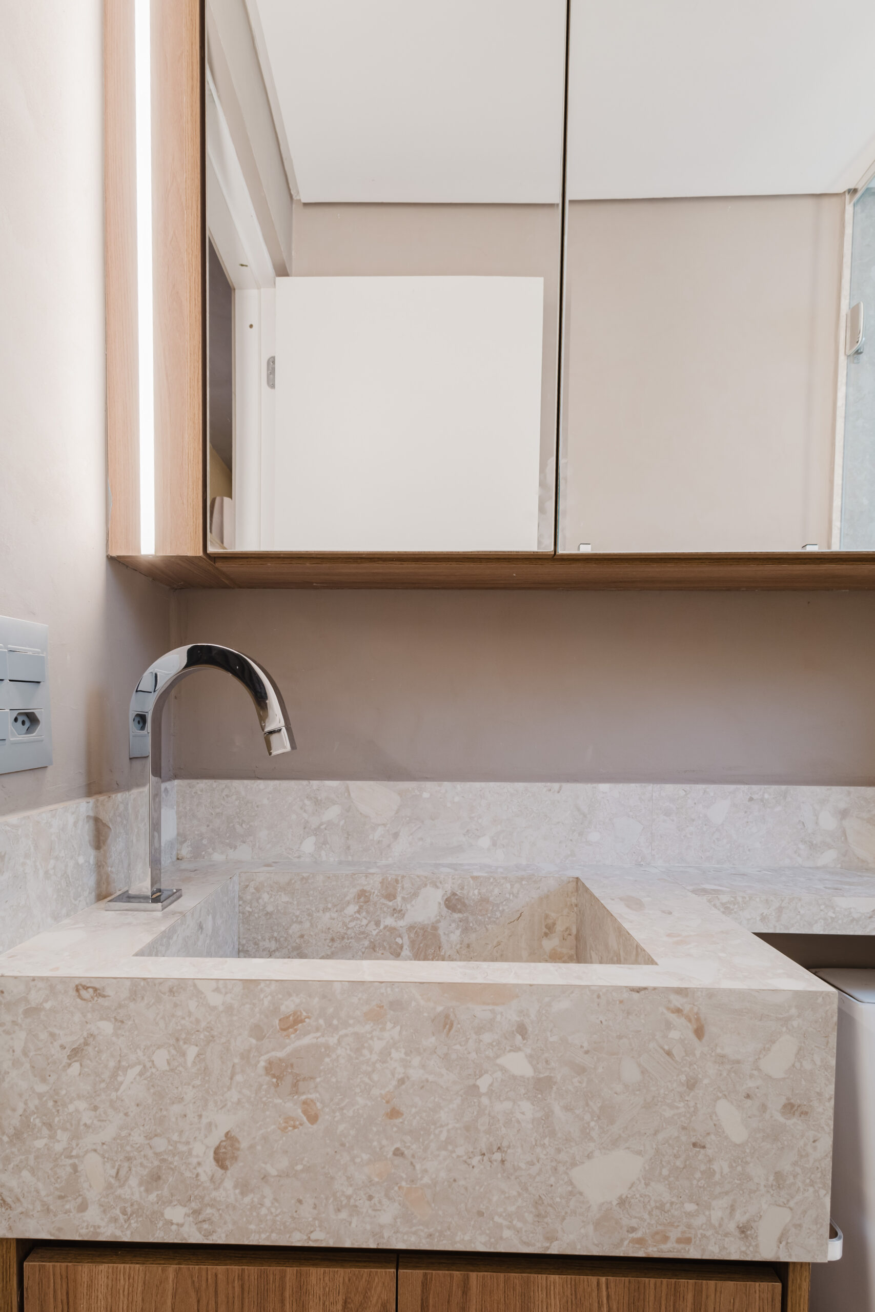 A bancada e a cuba em porcelanato foram executadas no mesmo material, garantindo unidade estética.